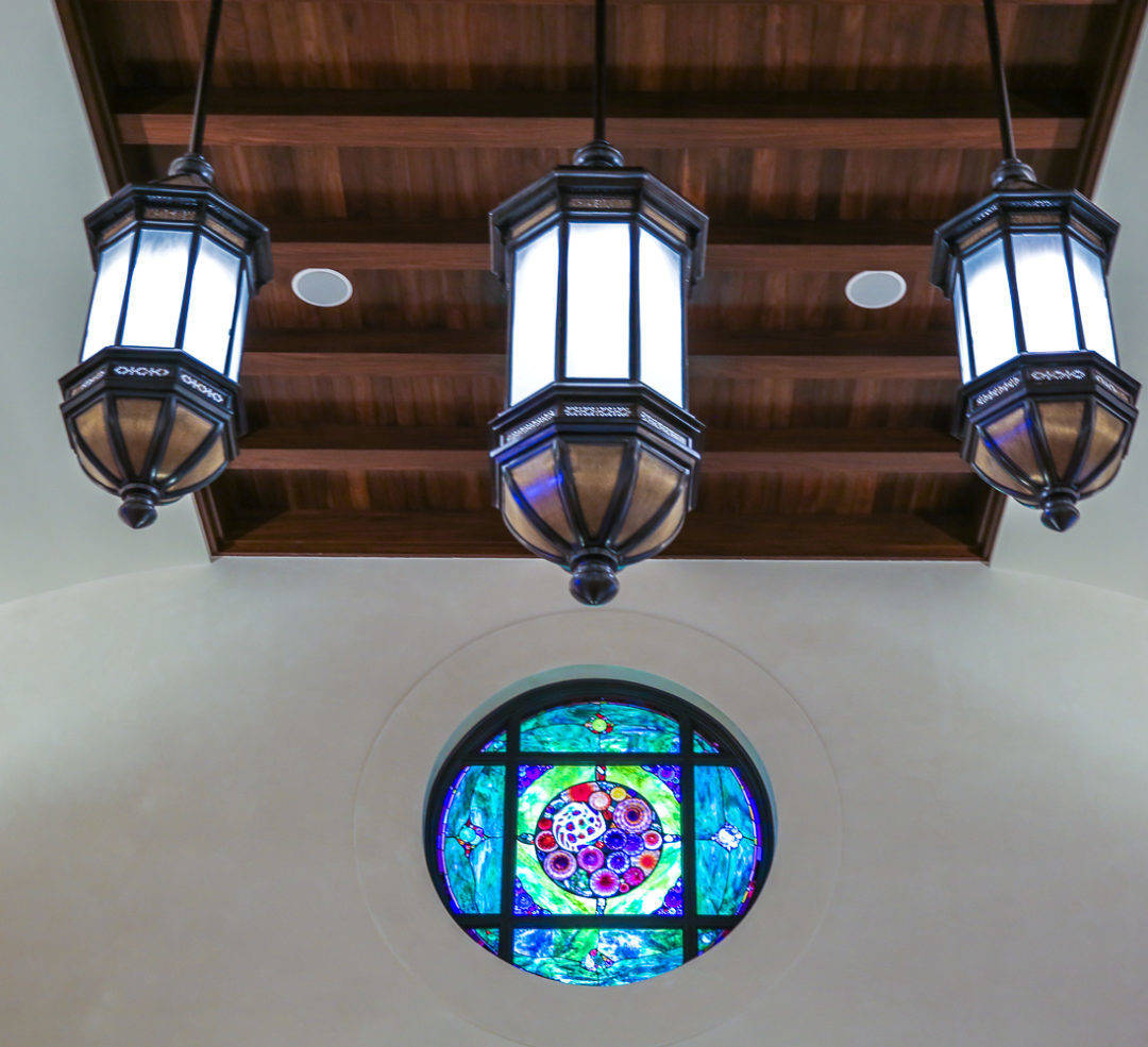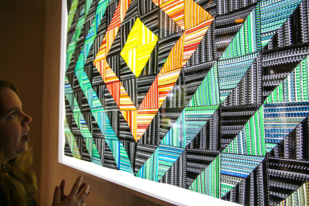 Even if you have little interest in looking at art, be sure to examine the work behind the hostess station at Hamilton’s Kitchen. The Alfonds commissioned this piece by Sabrina Gschwandtner. It is a quilt made entirely from archival 16mm film from The Fashion Institute of Technology. When looking closely on the backlit display, one can see the infinite tiny images of the film that will fascinate children. Then you will likely spend the next several minutes answering the question: “Mom, what is film?”