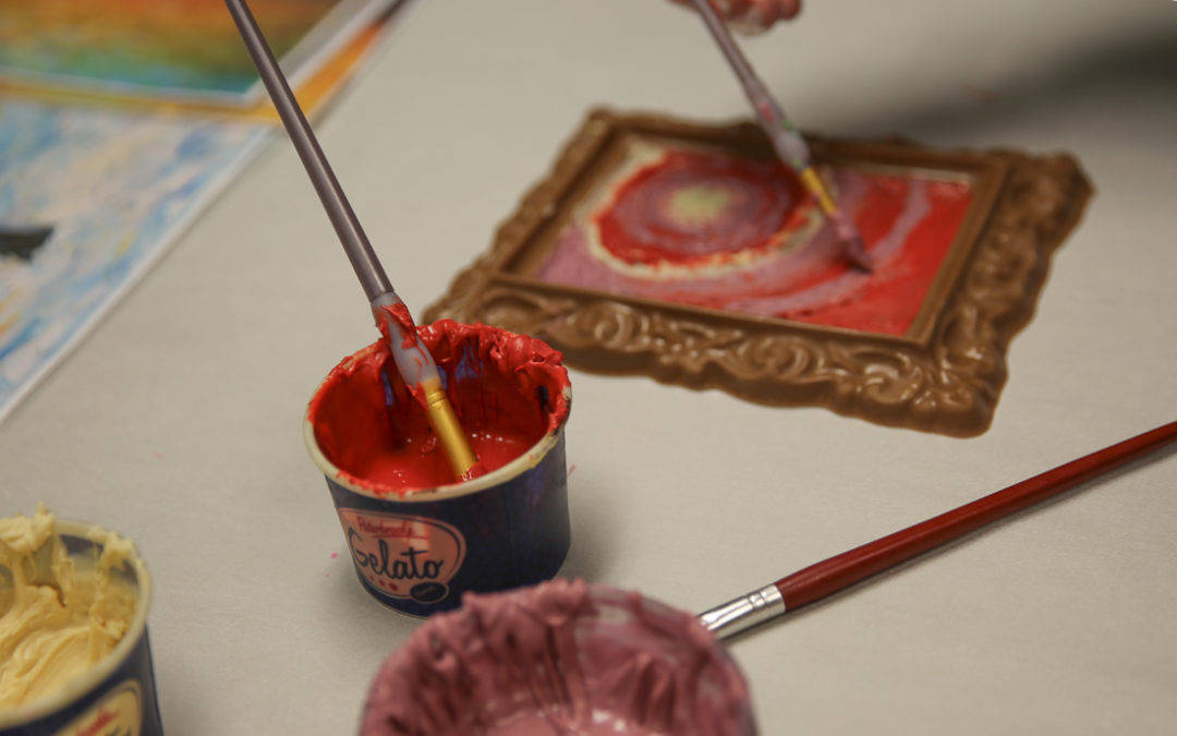 Every participant was given a chocolate frame to decorate. Amusingly the staff member procured protected sheets of Nineteenth and Twentieth Century masters. “Sure,” I thought. “I’d be delighted to replicate Starry Night using three colors of edible paint in less than thirty minutes.” Clearly previous attendees had set the bar higher than my capabilities.
