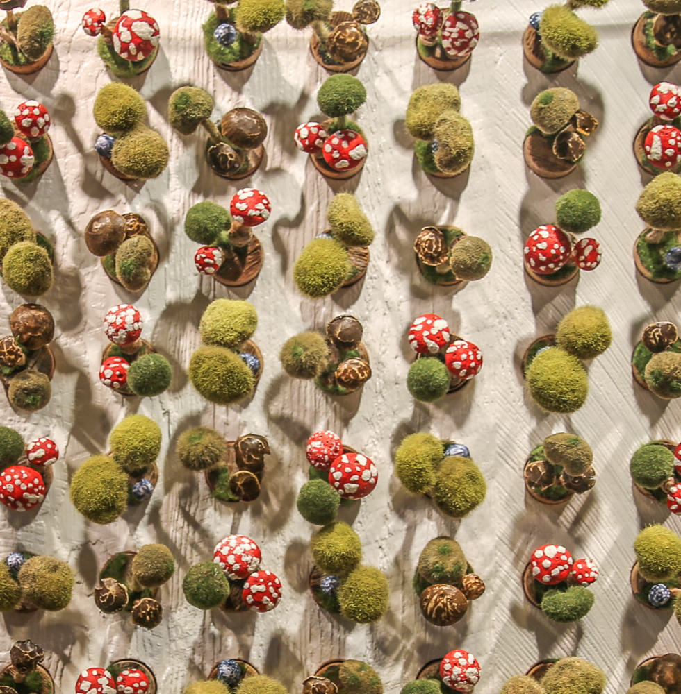 Another work in the hotel to engage its younger guests is the Brian Burkhardt mushroom plug tray outside the elevator on the fifth floor. Burkhardt is an artist and fashion and jewelry designer who lives in Miami whose younger years were spent on an organic farm. Ask your children to search for secrets hidden objects on the mushrooms to get them really concentrated on a piece.