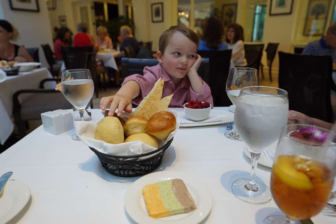 My children were offered kids’ menus, and the staff provided a fruit cup appetizer at my request to keep them from devouring a particularly artful bread basket and terrine of flavored butters. It didn’t work.