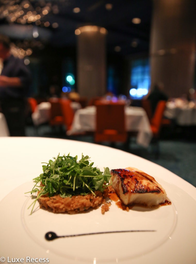 Dessert was incredibly memorable, worthy of its own film: a chocolate globe, concealing vanilla ice cream underneath, is stacked on a tower of chocolate torte and cinnamon apples. The server pours hot chocolate sauce on top as the globe melts before your eyes.