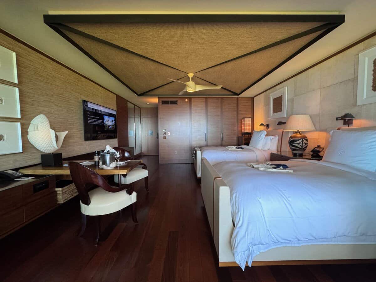 The resort’s 213 rooms spread across low-rise buildings along the coastline. Every room includes a private lanai, marble bathrooms with soaking tubs, and Four Seasons bedding. The cetegories’ distinctions lie primarily in views and space.