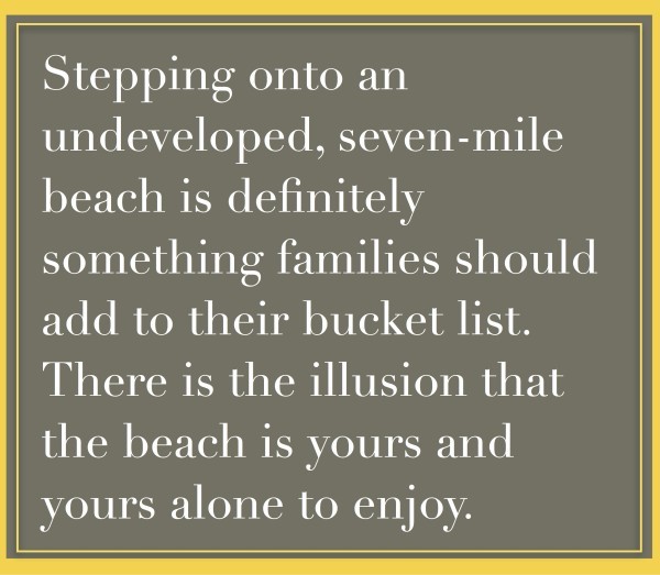 Trucks pull up to a beach gazebo stocked with chairs, water, sunblock, and the previous guests’ seashell finds. Stepping on to an undeveloped, seven-mile beach shared by, at most, 30 people, is definitely something a family should add to their bucket list.