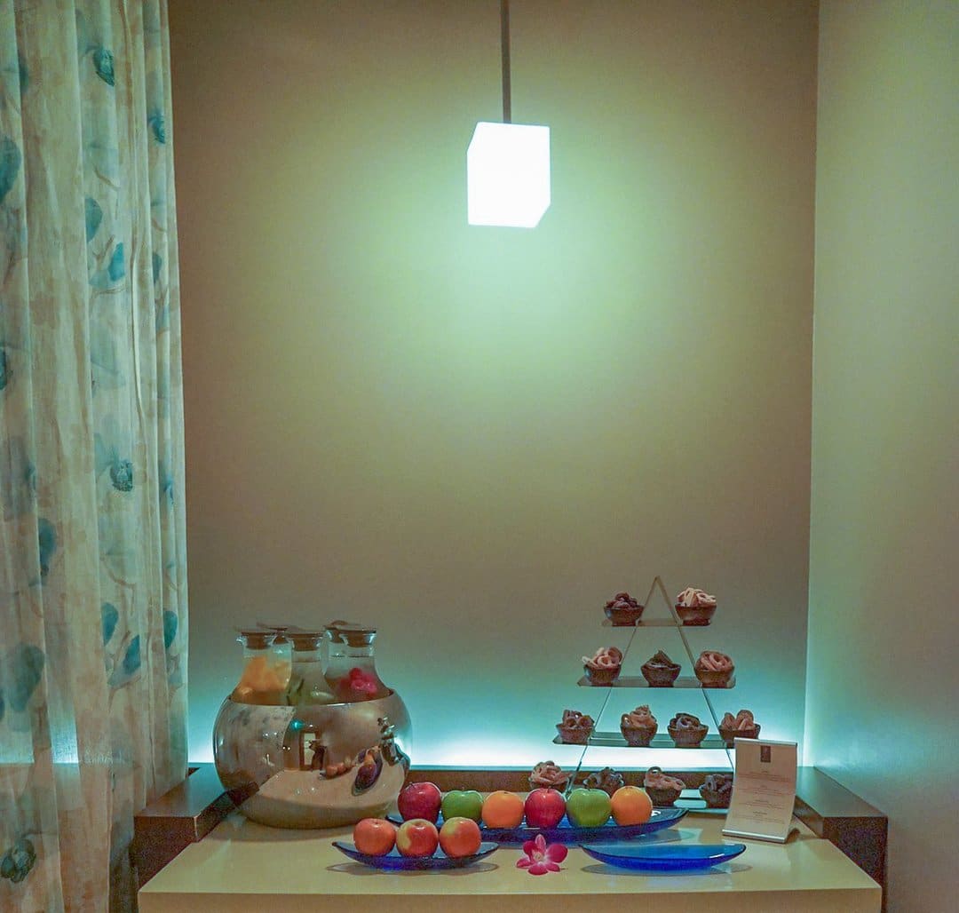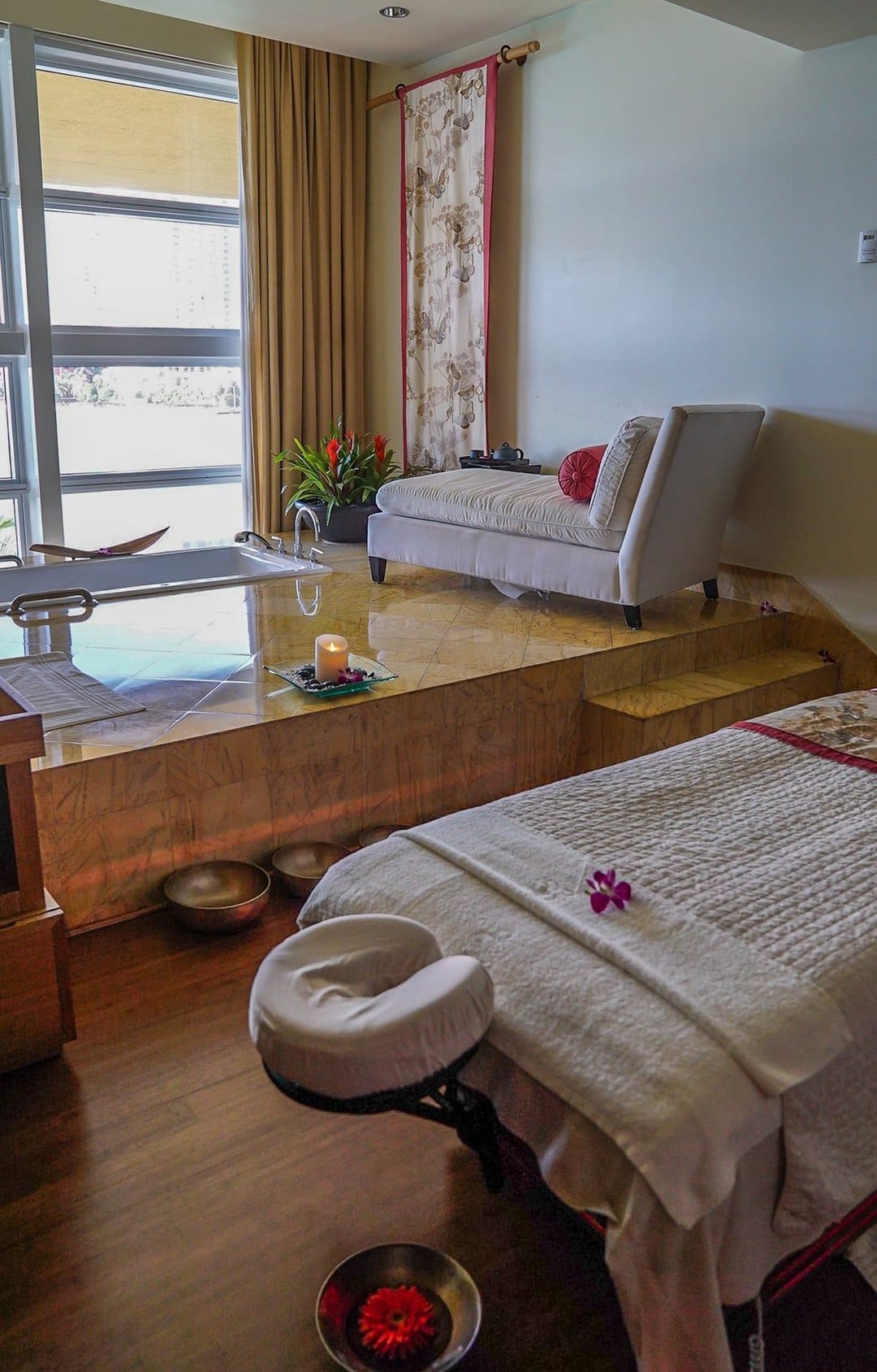 The spa off of the pool area is deceptively large and multi-storied. The “penthouse” level of the spa houses the specialty spa suites for couples, Thai and Shiatsu massage, and other fusion hydrotherapy treatments that involve tub soaks and showers.