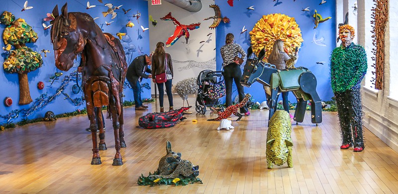 Federico Uribe’s sculptural animal garden engaged both of my children in deep concentration. Each animal was made with a repurposed item, like tape measures, discs, or bullet shells.