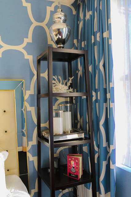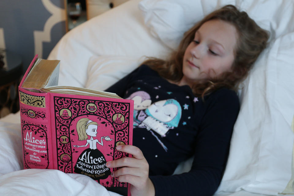 The étagère adjacent to the bed came with a vibrantly colored hardback of Alice’s Adventures in Wonderland which fit perfectly with the fantasy design.