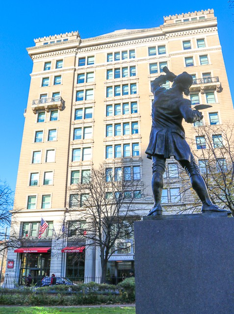 The hotel is adjacent to Independence Hall, and across the street facing the hotel is a statue of The Signer, honoring all of those white men who signed the Declaration of Independence.