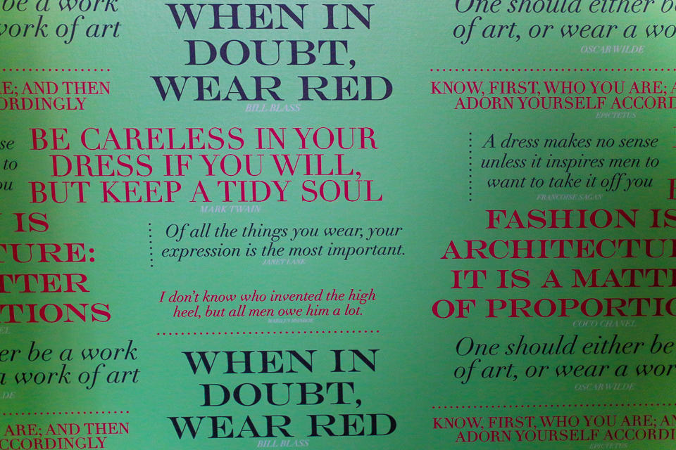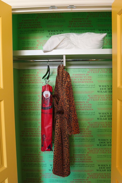 Where else could you peer behind bright yellow raincoat closet doors to find a kite, a yoga mat, and a leopard robe waiting for your vacation fun? To play up the local Philadelphia flavor, a robe made of sweatshirt material inspired by the movie Rocky also hung in a closet lined with beautiful fashion advice wallpaper, “When in doubt, wear red!”. Pure awesome.