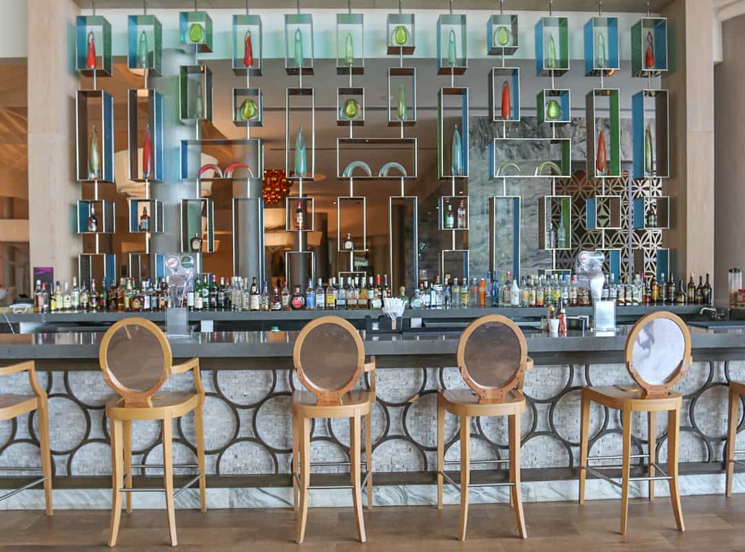 Moon Palace has a swanky vibe. With soaring ceilings dangling clear glass sculptures and very contemporary design, the resort feels new. Restaurant and bar areas are chic and upscale.