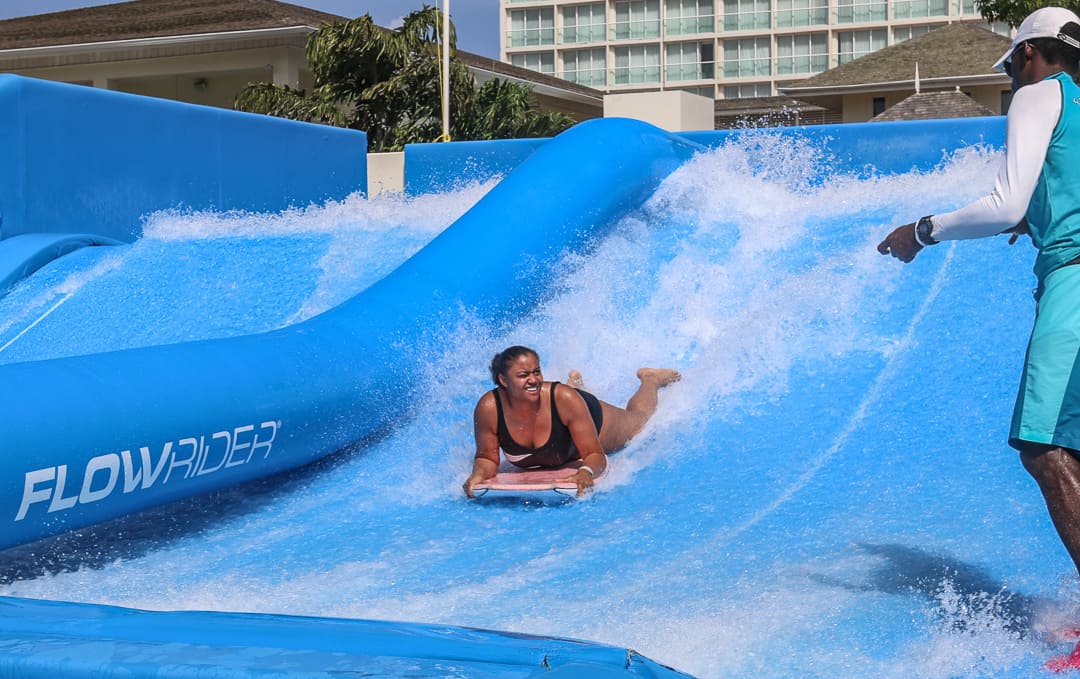 There is a large water slide and a flow rider, a surf simulator, where kids and parents try to skillfully balance on boards on foot on their stomachs before falling and being rushed up to top of the padded area. Even on your stomach, it’s a challenge.