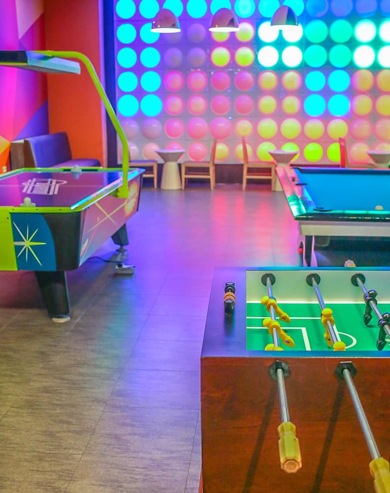 Air hockey, walls of legos, miniature-scaled arcade games, and a mini stage with an audience fill the rest of this wonderland.