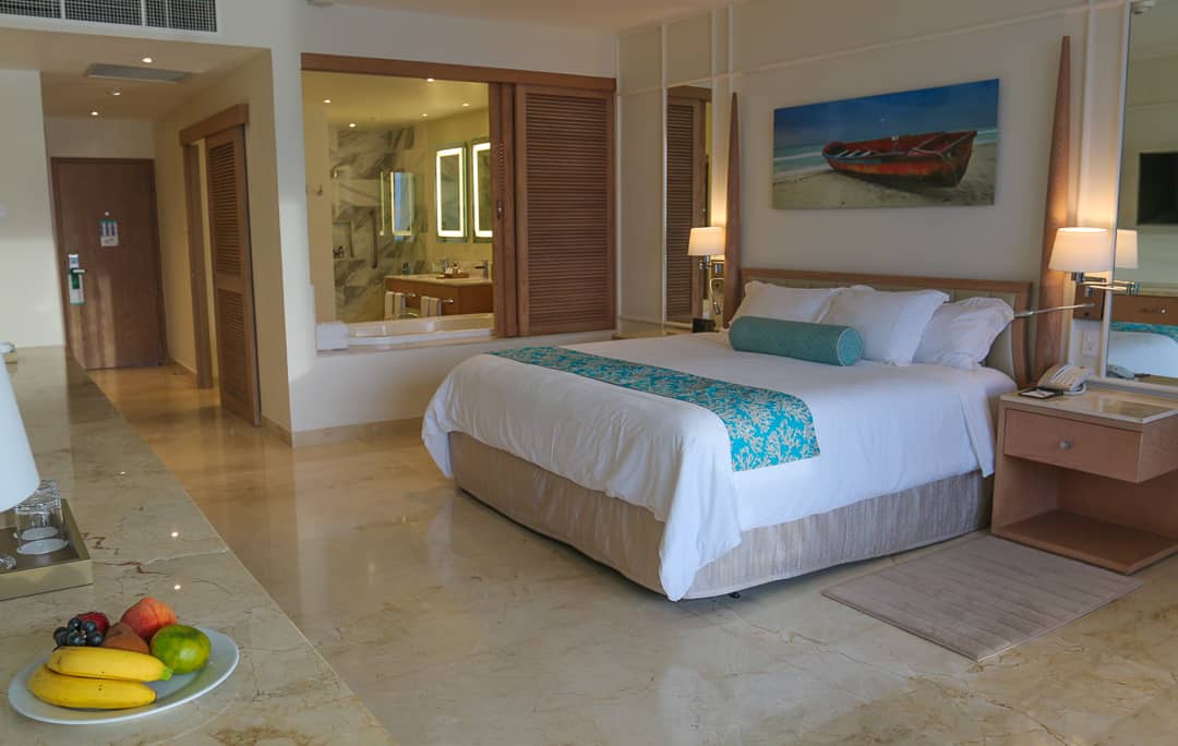 Rooms are well appointed with welcome fruit and cheese plates and bottles of wine. The mini fridge is stocked with water, sodas, and juices. There is also a liquor cabinet for those wanting to drink their money’s worth of the all-inclusive experience.