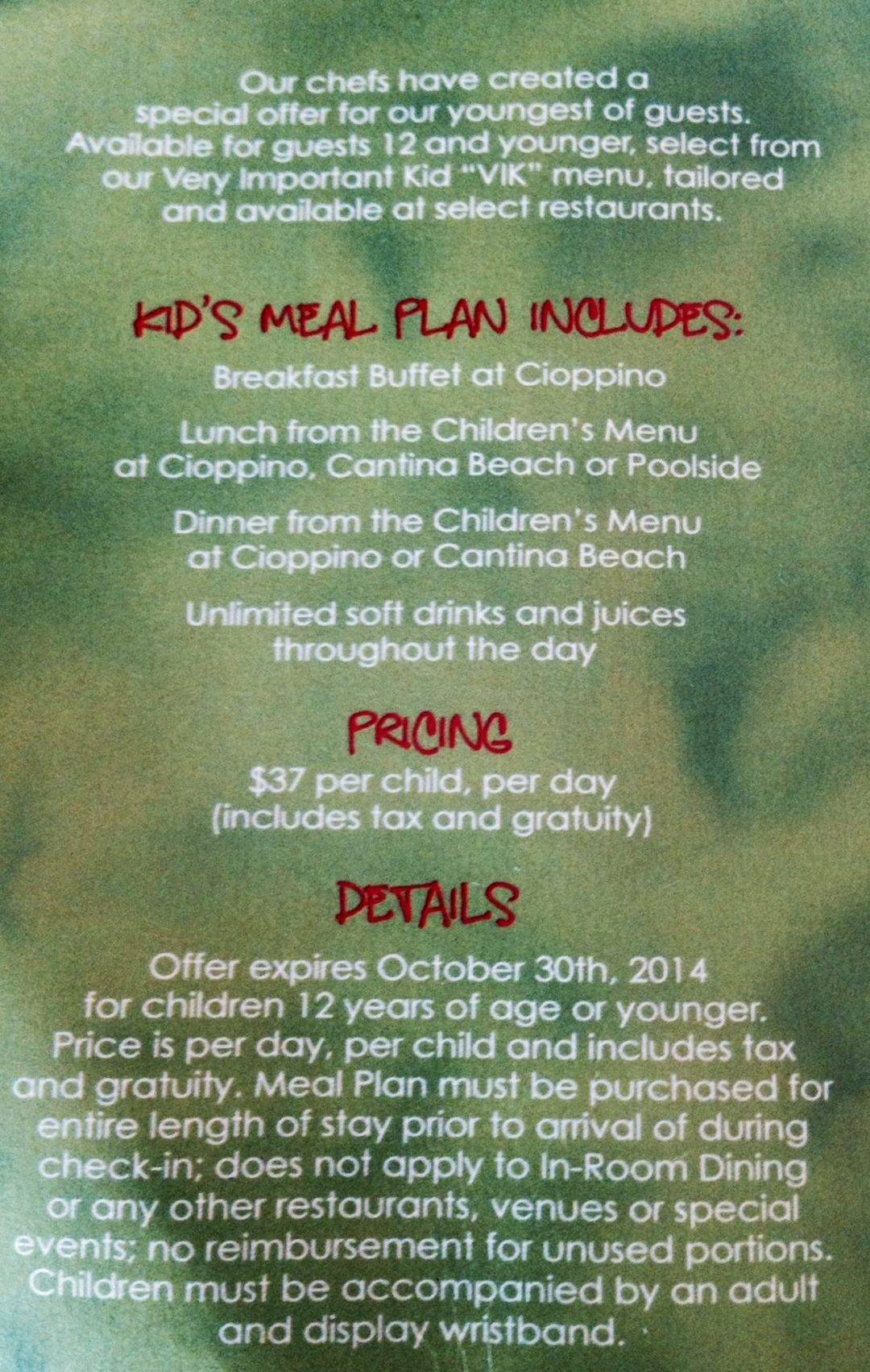 We were directed over to a booth that had the itinerary for children’s events scheduled for the holiday weekend. We usually check our kids into the Ritz Kids Club— a program that fills their day with games, swimming, tennis, and the experience of making friends with kids from another country. The front desk gave our girls red apples, coloring books, and crayons, and we were off to our room.