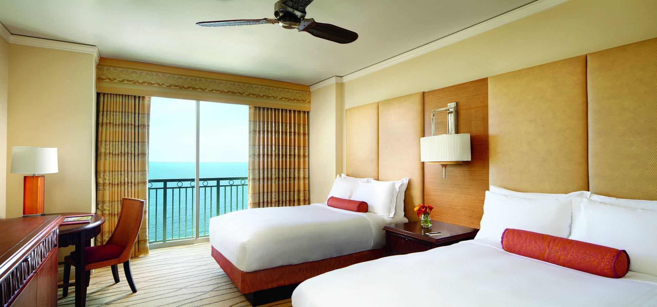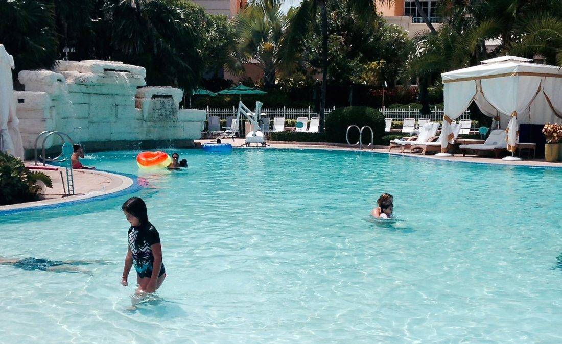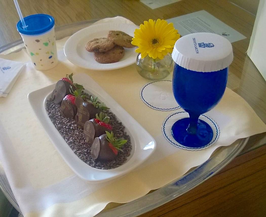 We had booked at the last minute, and couldn’t get a Club Level suite. That’s the Ritz Carlton version of ultimate luxury with access to an exclusive lounge for Club-level guests complete with drinks, snacks, and private concierge. We had to “settle” for the Ocean View Studio. The rooms were decorated in elegant palettes of cream and beige and featured two double beds, and a kitchenette. The views of the ocean were mesmerizing. The staff had a plate of chocolate chip cookies sent up, so my girls were over the moon. I was impressed that the room was big enough to comfortably accommodate a rollaway bed for my eldest, and a crib for my youngest without being a suite. The bathroom had a large Roman tub, liberal amounts of Asprey toiletries, and plush white robes. The linens were signature luxury hotel, and the mattresses were plush—not that we spent time too much time in our room when the weather was perfect.