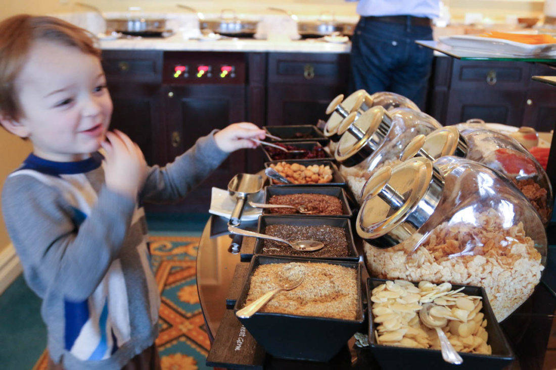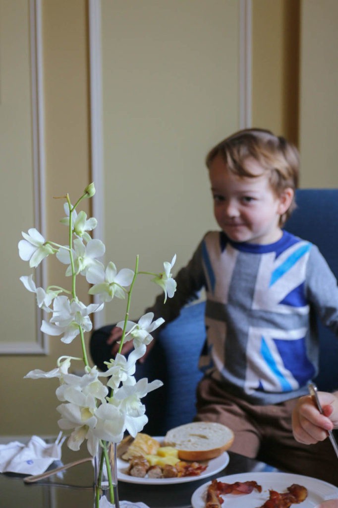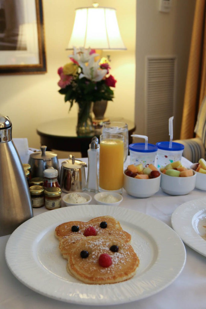On our last rainy morning we decided to stay in our room in our pajamas instead of heading to the club lounge where we’ve been enjoying breakfasts and afternoon treats. My children were delighted to receive Rudolph pancakes covered and berries and my egg white omelet it was excellent.