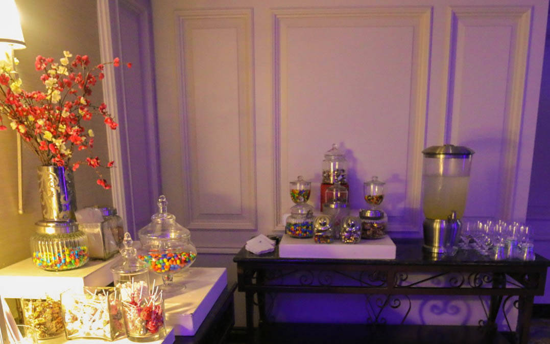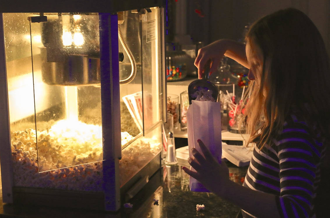 With blue and purple lights illuminating the corners of the room to feel like a Frozen-themed party, the room’s real star for any child was it’s server yourself concession stand. Behind the popcorn machine was a candy bar ready to beat any trick-or-treating experiences: mini Twix, mini snickers, jellybeans, M & M’s— peanut and regular. It was all there with a cooler filled with lemonade of which my son kept saying “This water’s tasty!”