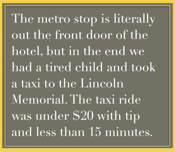 The metro stop is literally out the front door of the hotel which we planned to use on our day of sightseeing, but in the end we had a tired child and decided to spend for a taxi to the Lincoln Memorial. Both taxi rides were under $20 including tip and less than 15 minutes.