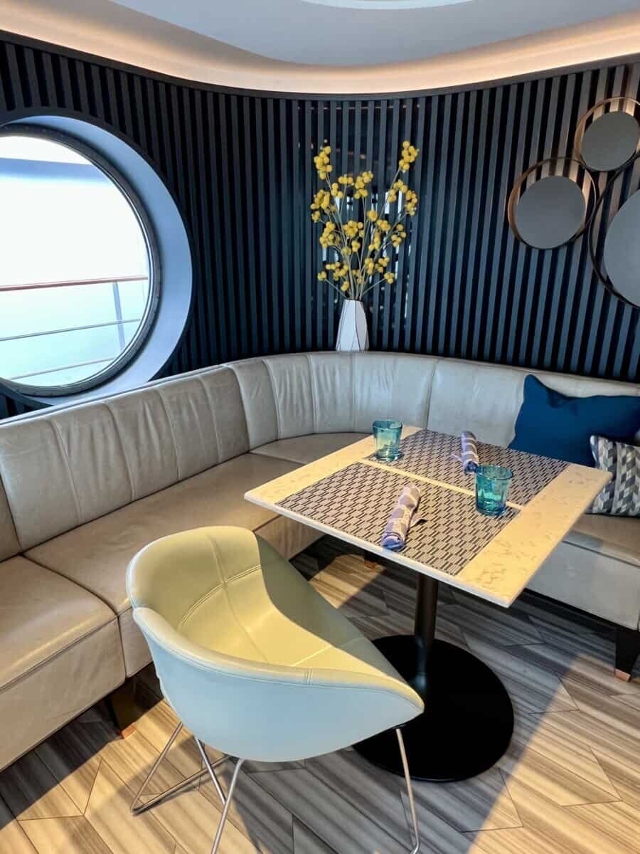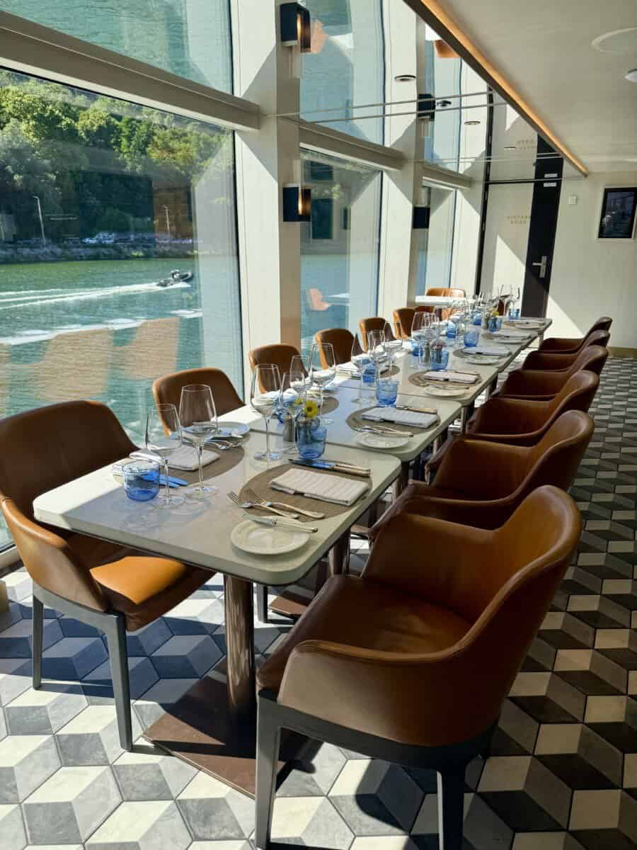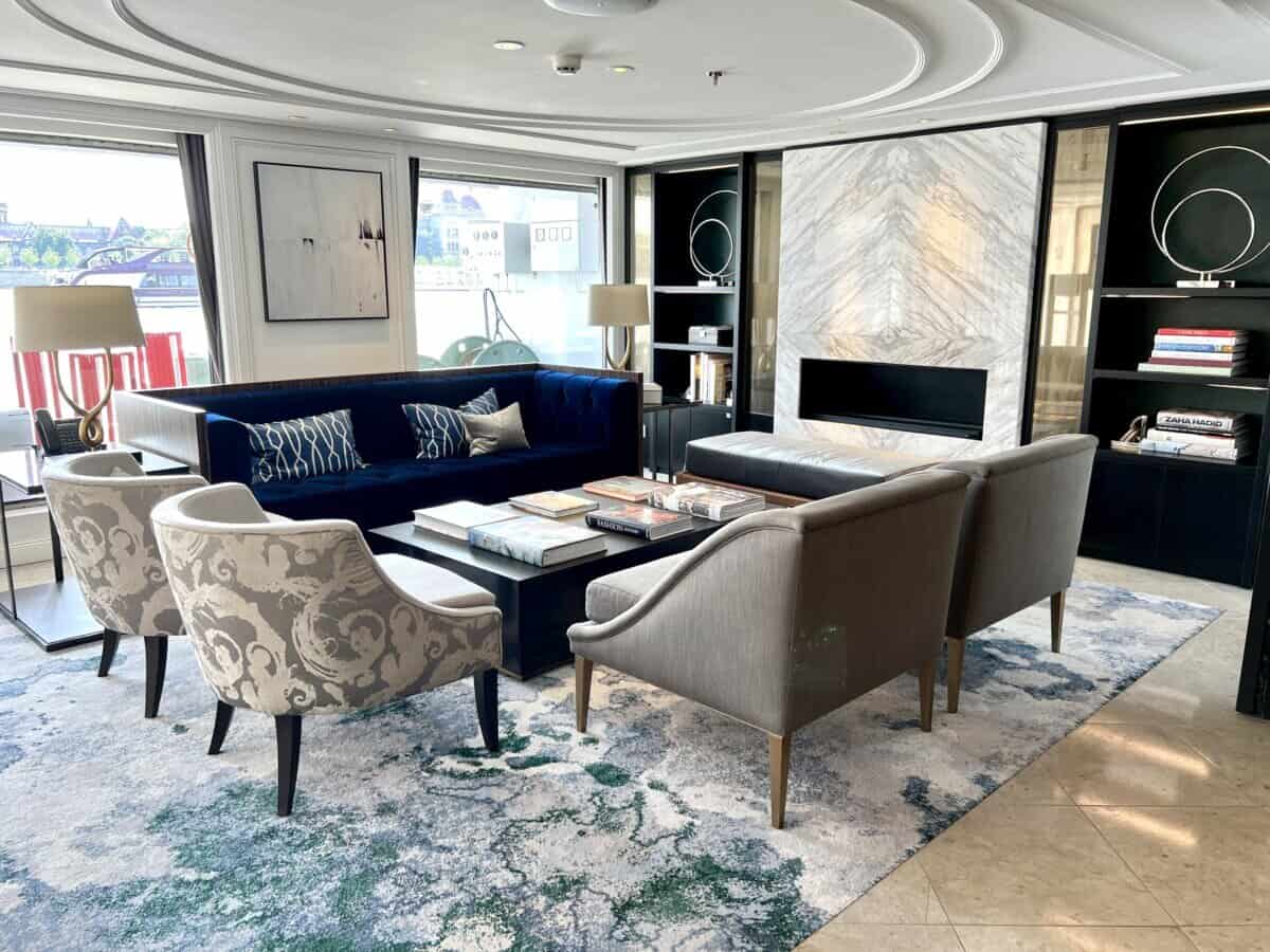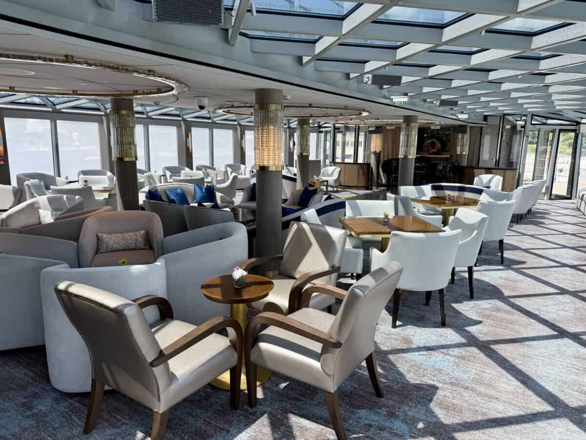 What struck me most about both the Mozart and the Ravel was how modern and inviting the public spaces feel, especially compared with typical river cruise ships. The interiors are stylish without feeling stuffy, with polished chrome, matte brass, modern lighting, and marble tables. Seating areas have velvet cushions in rich colors and leather banquettes, which is a welcome change from the usual river cruise décor. The large windows let in plenty of sunlight, making the spaces bright, airy, and appealing even to teens who might otherwise be hard to impress.