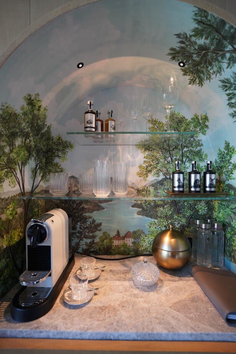 Standard rooms feel more intimate and are better suited to couples. We can assist families getting adjacent or connecting rooms. One charming detail: every room features a hand-painted minibar by Austrian artist Marie Hartig depicting the four seasons, stocked with local treats and premium spirits.