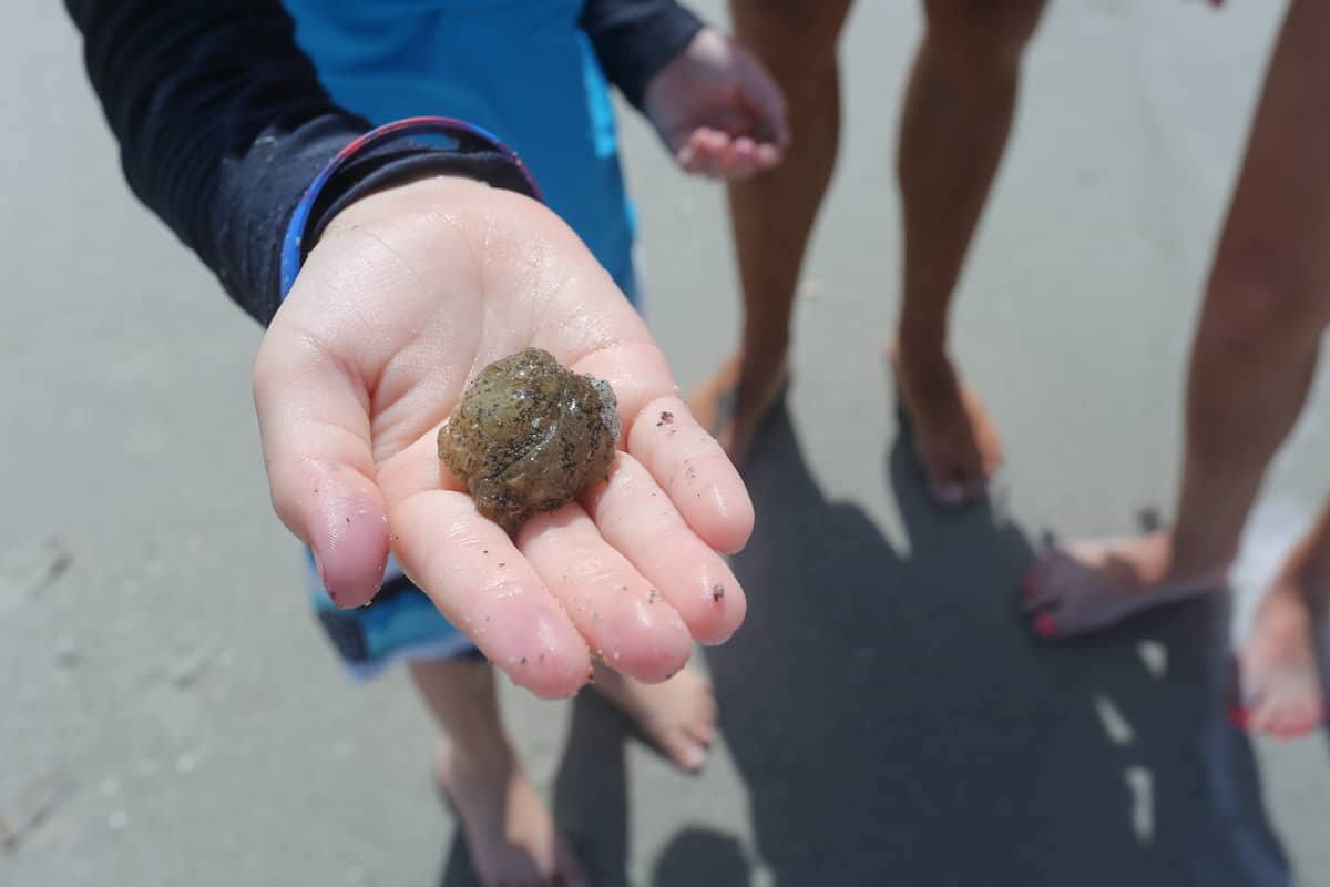Johnny tried, but failed, to teach my son how to make a whistle from seaweed. My son was very impressed by the dead puffer fish they found.