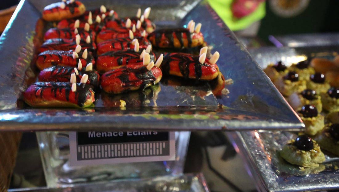 There was a Nutella-themed liquid nitrogen creation offering a mysterious space feel. Darth Maul eclairs, BB8 droid cupcakes covered in white chocolate BB8’s and rock candy, Darth Vader chocolate cupcakes, and C-3PO cheese crackers. I found the best dessert to be a trash compactor-themed bread pudding that had everything but the kitchen sink as a topping that was served with vanilla ice cream.