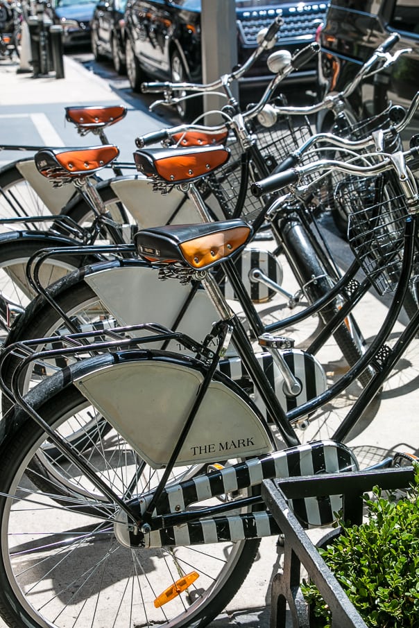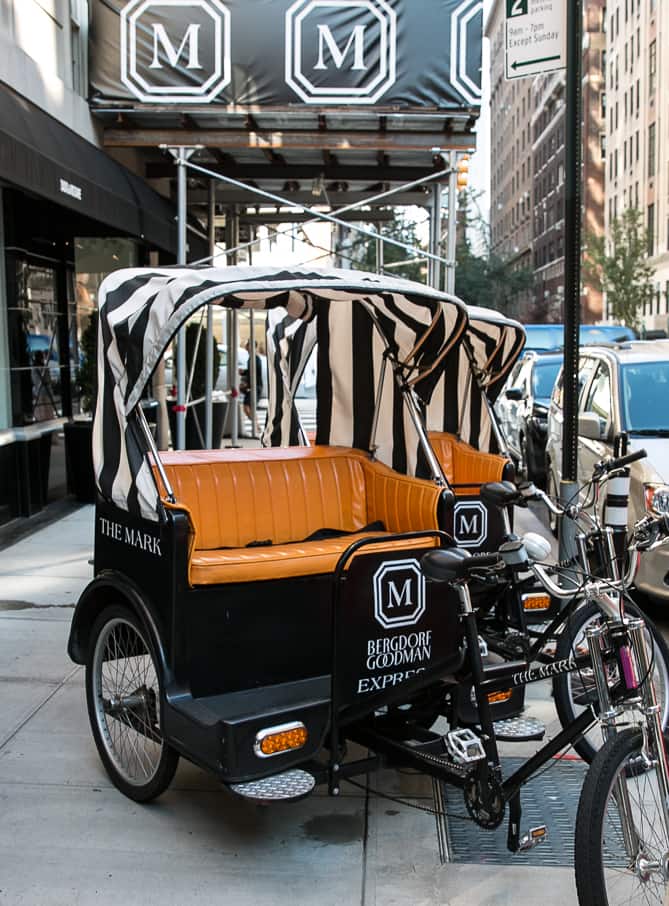 You’ll see the hotel’s playful side even before you enter. Striking black, white, and orange Mark bicycles, a Mark hotdog cart, and a Mark Pedi cab touted as the Bergdorf Goodman express surround the front entrance.